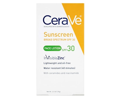 CeraVe Face Lotion SPF 30 is an affordable, mineral-based sunscreen cream that’s also dermatologist-approved. Like their regular face moisturizer, this formula also includes hyaluronic acid, ceramides, and niacinamide to moisturize skin and fortify its natural protective barrier. It dries clearly and is lightweight, water-resistant for up to 40 minutes, and easy to blend and wear under makeup. It gets bonus points for being sensitive skin-friendly, as its formula has been awarded the National Eczema Association Seal of Acceptance, and it’s oil-, fragrance-, and paraben-free, to boot.